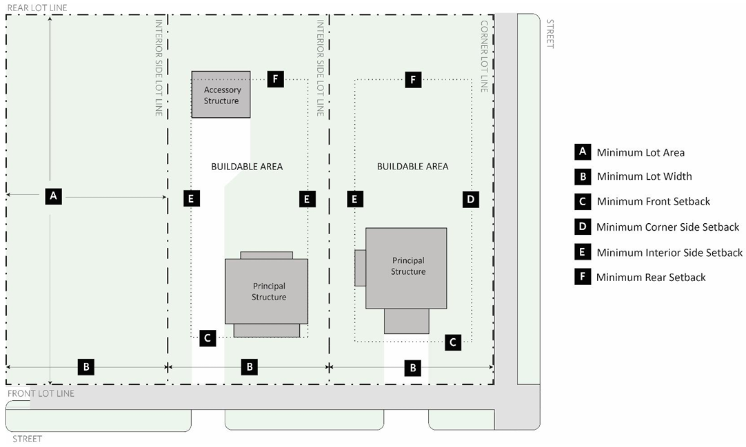 Zoning Ordinances establish development standards that work together to create a look and feel for different parts of the community. The standards include regulations for lot size, building setbacks, building height, lot coverage, open space, landscaping, and parking. A few of these key terms are defined below: